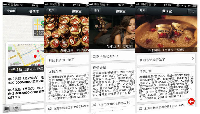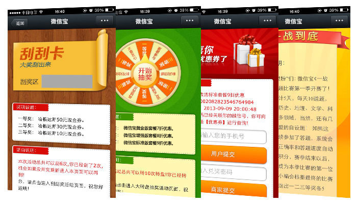 我们将利用微信的强交互性,让您通过对互动流程、环节和方式的设计,运用各种设计活动从而实现与用户的互动交流,,微整合系统互动符合微信娱乐性强的产品本质,微信宝内置了专为商家定制的“商家营销服务模块”,包括优惠券推广模块、幸运大转盘推广模块、刮刮卡抽奖模块、微投票、一战到底等功能模块,商家通过发起营销活动,对已有客户进行再营销,通过不断更新补充主题,用户可以反复参与,并可带动周边朋友一起分享,从而形成极强的口碑营销效果。