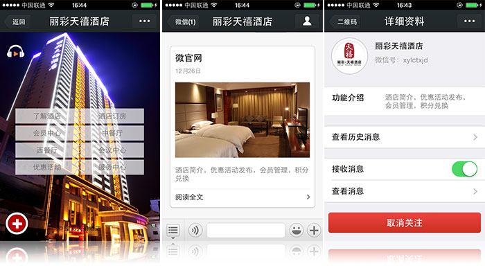 4、数据统计:各式各样的数据为后期运营提供重要帮助。 5、提供服务:用户直接可在公众账号进行预约房间、预约餐厅等操作。