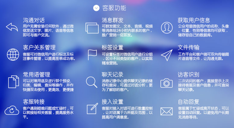 1、消息管理:包含自动消息回复和功能性消息编辑功能,优化对用户的消息服务,提升用户体验。