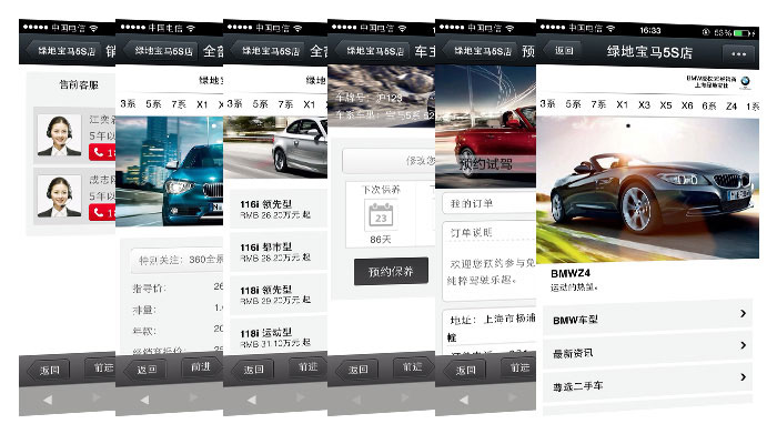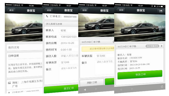 微汽车采用微信宝平台进行汽车的销售管理、预约保养、预约试驾、保险计算、车贷计算、车型比较、违章查询、360度全景看车、车主关怀等功能,整个过程非常便捷,省时省力省心,并通过与微信宝平台有交互能力的手机客户端,快速便捷的实现了商家的销售管理与预约过程,同时也实现了客户无需进入4s店就能进行预约保养和试驾的功能。